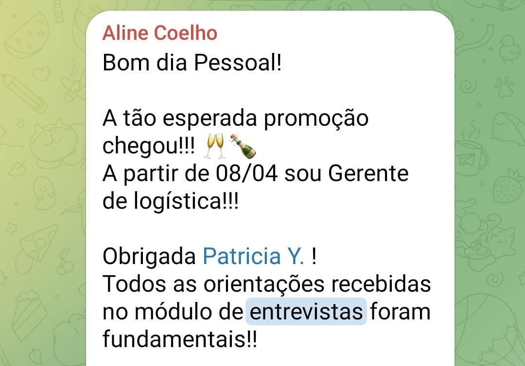 Aline, seguiu as orientações de entrevista que eu dei e conseguiu se tornar Gerente de Logística.